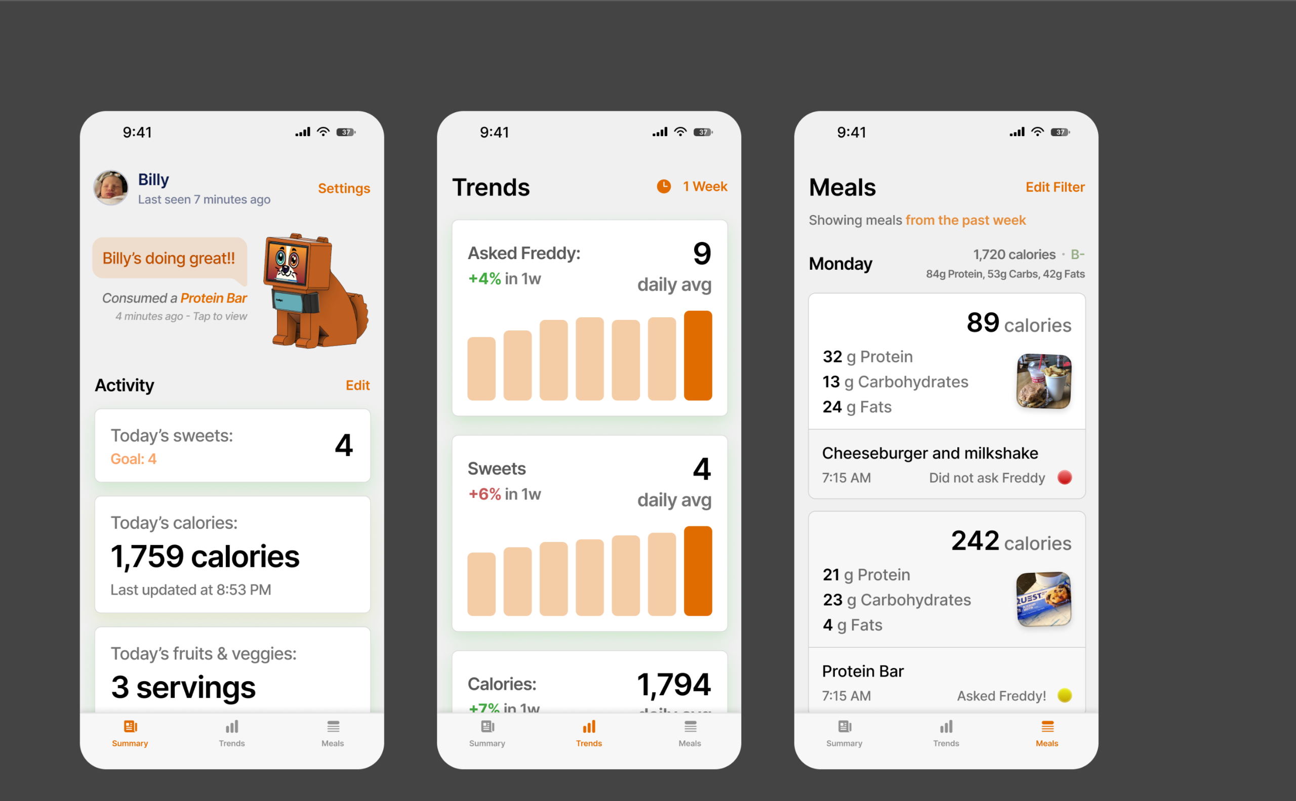 Freddy is an AI-powered platform with a playful robot dog that makes tracking kids' nutrition effortless and fun while providing real-time insights for parents.